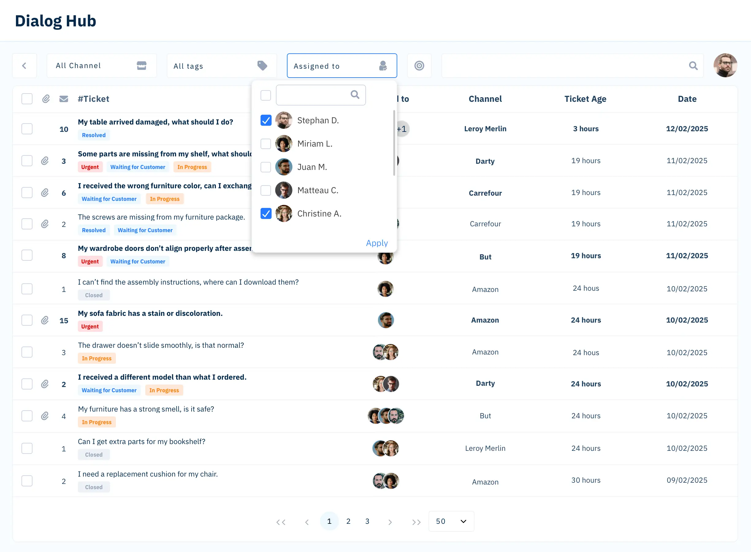 Dialog Hub centraliza todos tus mensajes de clientes de marketplaces en una única interfaz intuitiva. Etiqueta, asigna y comparte documentos fácilmente con tu equipo para asegurar una comunicación más rápida, clara y colaborativa.